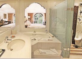 El cuarto de baño es un estupendo espacio para consentirse: luce finos mármoles y acabados de lujo; tendrá a su disposición una exclusiva columna de hidromasaje, tina o jacuzzi, un amplio tocador, secadora de pelo, amenidades de lujo, un amplio menú de agradables toallas, suaves batas de baño y cálidas pantuflas.